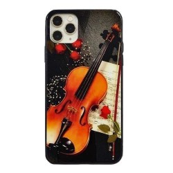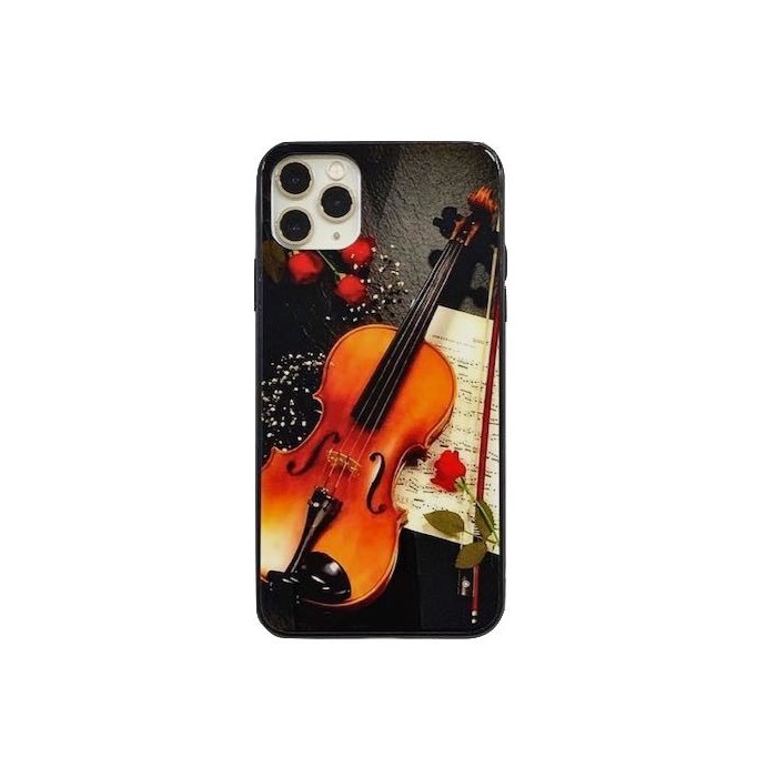 Coque protection arrière en verre, bord en silicone, pour iPhone. Motif violon. Originale et très élégante.