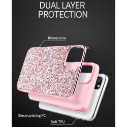 Coque protection arrière pour iPhone. Elle se compose de trois parties, contour frontal, élément arrière strass incrusté et un compartiment en silicone épais entre deux.