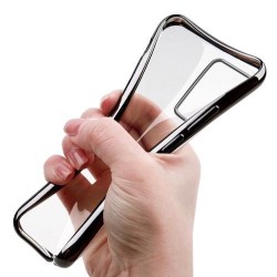 Coque iPhone, protection arrière en silicone transparent, bord couleur argent. Accès facile à tous les boutons de commande.