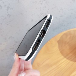 Coque protection arrière pour iPhone. Se compose de deux parties, arrière vitre transparent-contour bumper silicone, et un contour en plastique superposé. Protection des bords renforcée. Anti chocs.