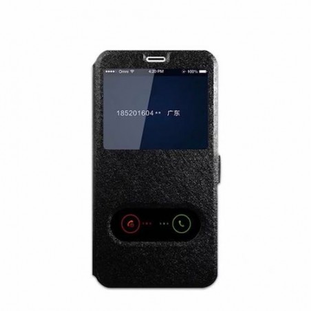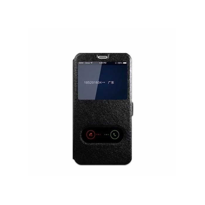 Etui-housse iPhone, protection totale en simili-cuir, coque intégrée, fermeture magnétique sur le côté. Double fenêtres, une vous permet de voir l'heure ou le nom de l'appelant, et l'autre pour répondre ou raccrocher, en slidant par glissement de doit dans la fenêtre du bas. Accessibilité facile à tous les boutons et maintien très agréable. Pas d'épaisseur.