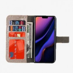 Etui-housse iPhone, protection totale en cuir-simili de haute qualité, brillant, intérieur coque en silicone intégrée, compartiment de rangement de cartes, et fermeture magnétique. Accessibilité facile à tous les boutons et maintien très agréable.