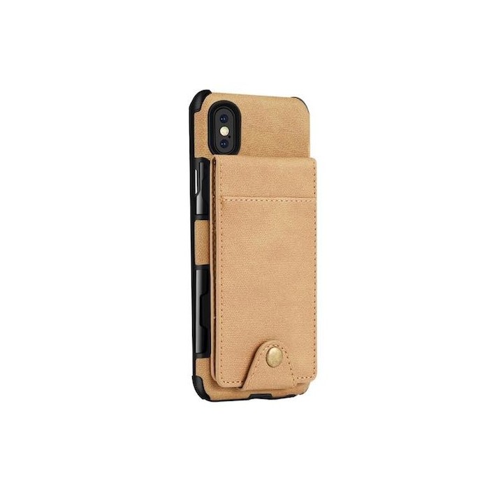 Coque protection arrière pour iPhone. Se compose de deux parties. Intérieur silicone et extérieur tissu synthétique résistant. Compartiment double pour rangement de cartes. Anti choc, anti glisse.
