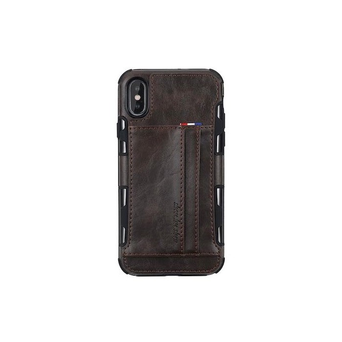 Coque protection arrière pour iPhone. Se compose de deux parties. Intérieur silicone et extérieur similicuir. Rangement de cartes. Anti choc, anti glisse.