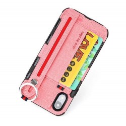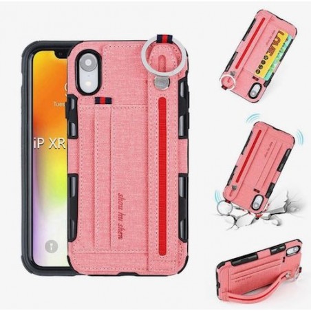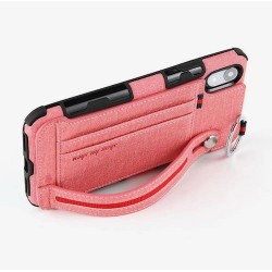 Coque protection arrière pour iPhone. Se compose de deux parties. Intérieur silicone et extérieur synthétique de qualité. Rangement de cartes, Bande de maintien et/ou support de visualisation. Anti choc, anti glisse.