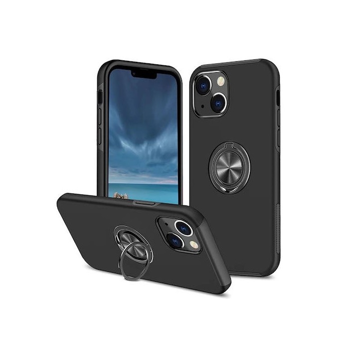 Coque protection arrière robuste pour iPhone. Elle se compose de deux parties, intérieur silicone et contour plastique dur. Support anneau avec rotation à 360 degré. Anti chocs, anti dérapant.