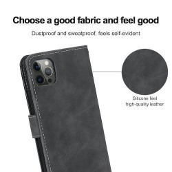 Etui-housse iPhone, protection totale en cuir-simili de haute qualité, aspect daim, intérieur coque en silicone intégrée, compartiment cartes, fermeture à clapet magnétique. Votre téléphone est complètement sécurisé du fait qu'il soit protégé du côté avant, arrière et du contour à 360 degré. Accessibilité facile à tous les boutons et maintien très agréable.