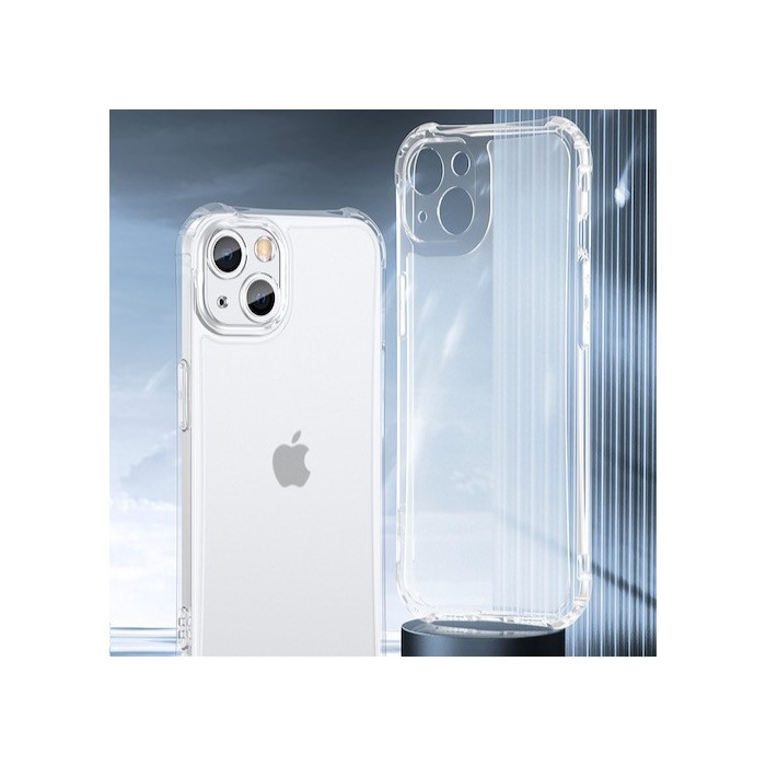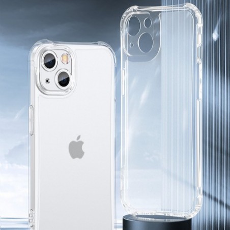 Coque iPhone, protection arrière transparente en silicone souple, coins renforcés et protection caméra.