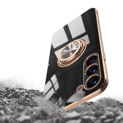 Coque pour Samsung S24Plus, protection arrière en silicone souple. Couleur noir avec bordure dorée, anneau, bague à l'arrière pour maintien ou support visualisation.