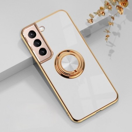 Coque pour Samsung S24Plus, protection arrière en silicone souple. Couleur noir avec bordure dorée, anneau, bague à l'arrière pour maintien ou support visualisation.